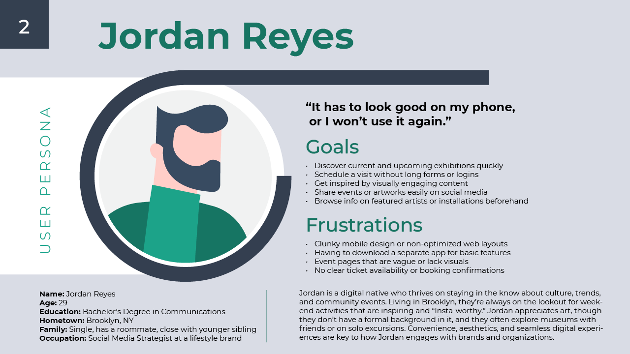 I conducted a mix of secondary research and user interviews to better understand the needs and behaviors of museum visitors. Insights from this research showed that a large portion of museum-goers are older, highly educated adults. This finding guided my design decisions, reinforcing the importance of strong readability, clear information hierarchy, and accessibility for a desktop-oriented audience.